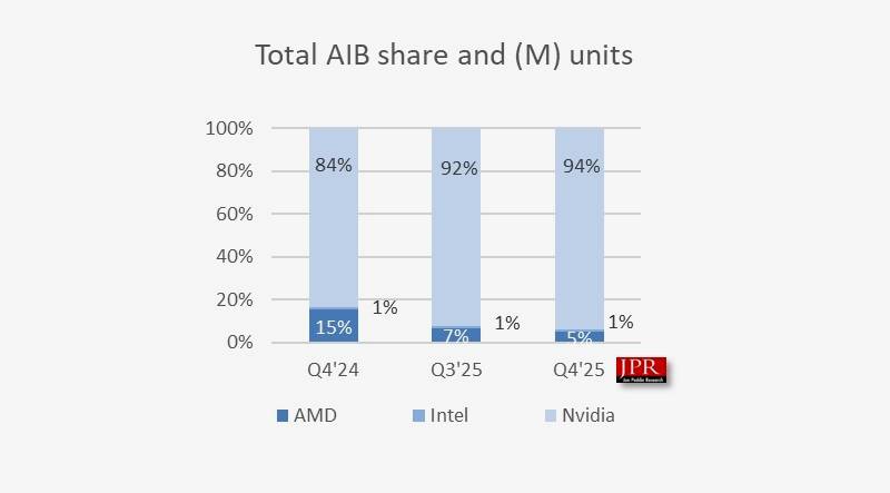 Jon Peddie Research'ün son verileri, NVIDIA'nın 2025 yılının dördüncü çeyreğini %94 pazar payı ile kapattığını doğruluyor. Bu, 2025 yılının üçüncü çeyreğine göre %2'lik bir artış anlamına geliyor.